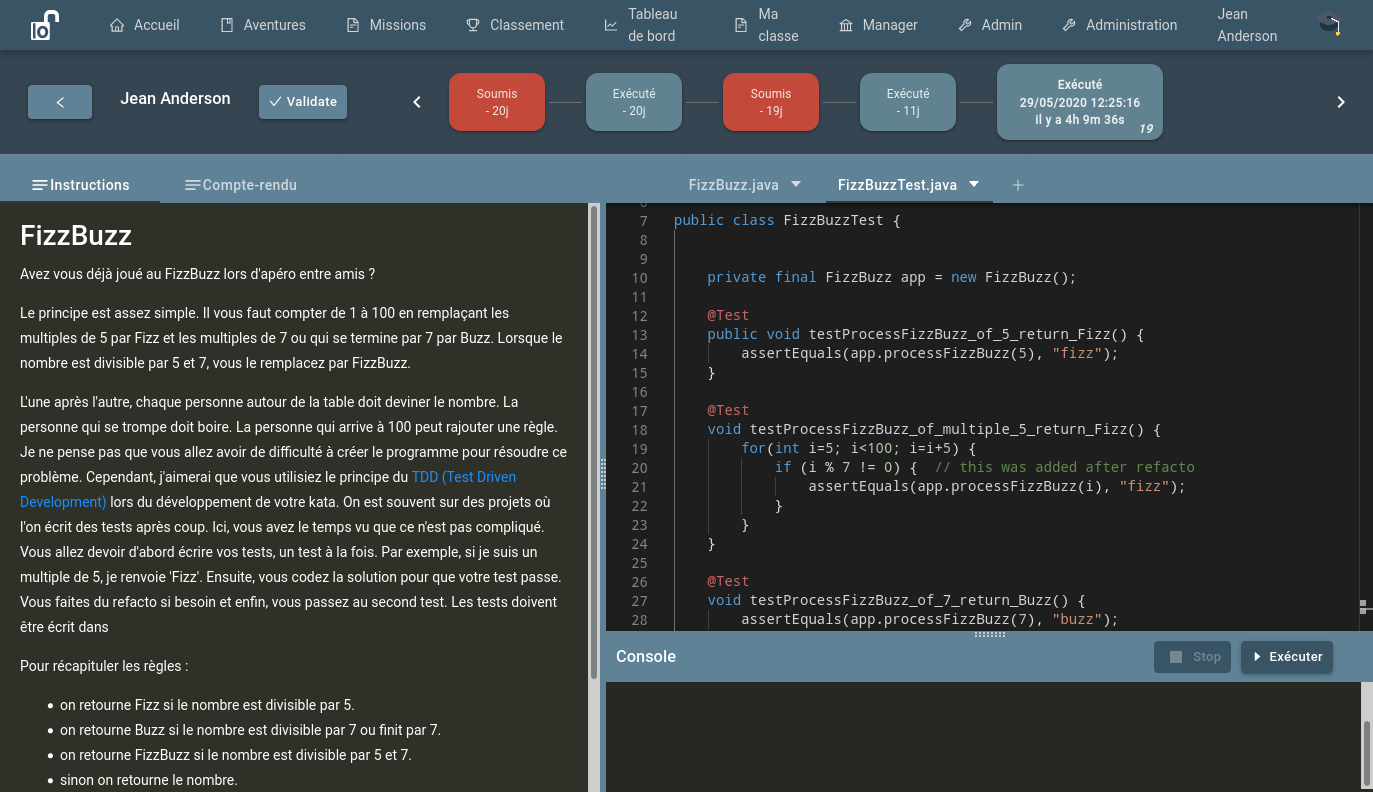 - Faciliter le travail de l’enseignant : Deadlock permet de plus facilement détecter les étudiants en difficulté. En automatisant l’évaluation et la collecte d’indicateurs de niveau de chaque élève, la plateforme donne à l’enseignant la possibilité de comprendre le processus de réflexion de l’étudiant et non pas seulement d’évaluer son résultat. Les outils intégrés permettent au delà de la validation algorithmique, de s’assurer du respect des bonnes pratiques et conventions de code tellement importantes dans ce domaine.
