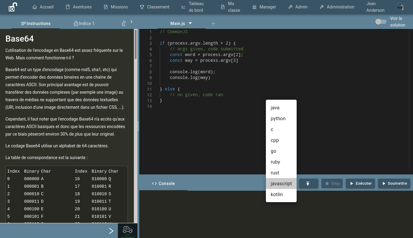 L’enseignant peut coller le lien vers l’énoncé, dans le fil de discussion de l’outil de communication du cours (en l’occurrence, la conversation Teams).L’étudiant accède alors à la fenêtre de l’exercice (cf Illustration 1). Il est alors invité à lire l’énoncé (éventuellement accéder à des indices). Il dispose d’un éditeur (avec colorisation) pour coder la solution qu’il propose, pour l’exécuter et vérifier qu’elle est correcte, et enfin, une fois qu’il juge que le résultat satisfaisant, il peut soumettre sa solution à l’enseignant.