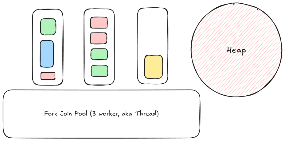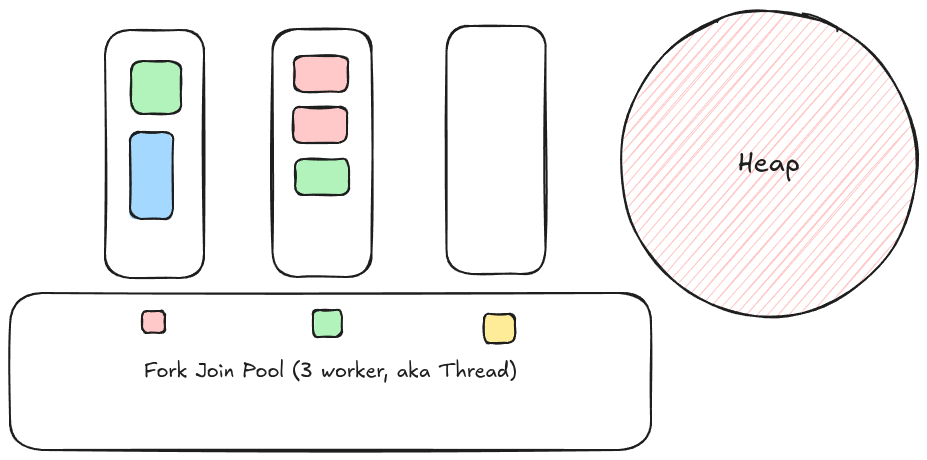 Voici un pool de 3 Threads (de type ForkJoinPool) qui va exécuter un ensemble de VT (tous les rectangles de couleur).