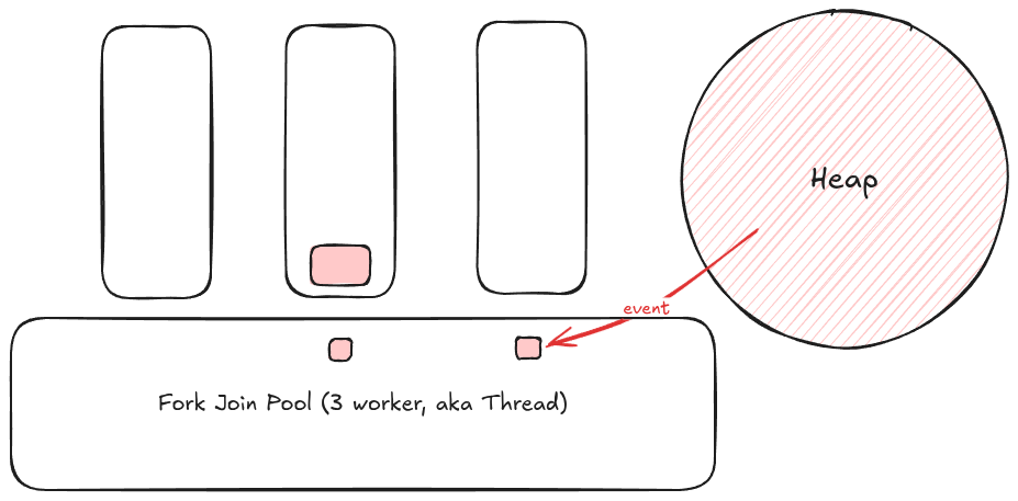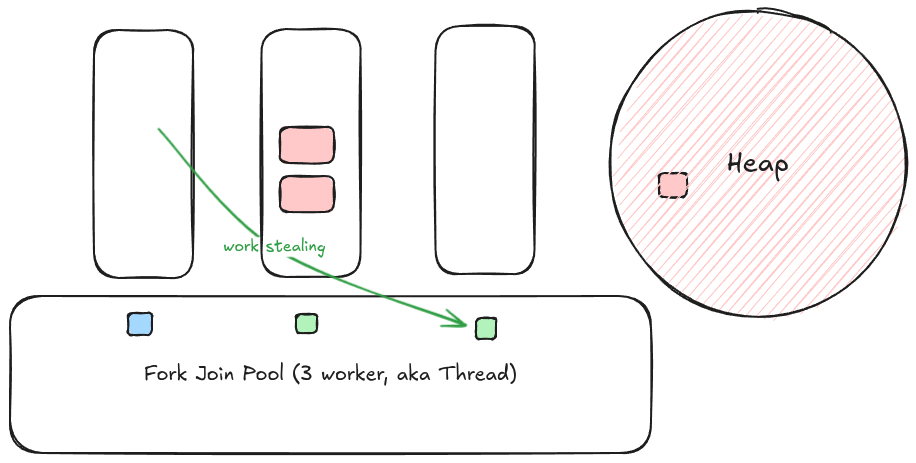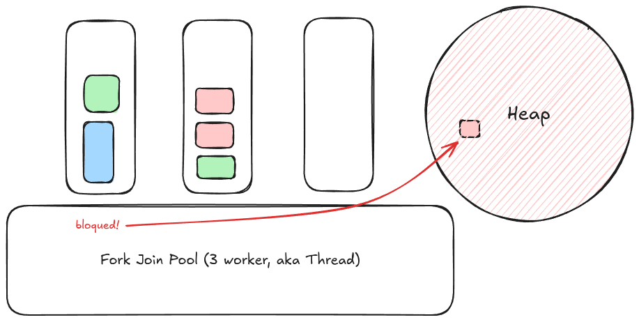 Lorsqu'une task rencontre une opération bloquante, le worker l'envoie dans la Heap, le contexte d'exécution (la stack) de la VT est compressé pour plus tard, on obtient un code asynchrone. On comprend alors que tout notre code actuel bloquant peut DÉJÀ tourner dans des VT sans aucune modification, merci Loom!