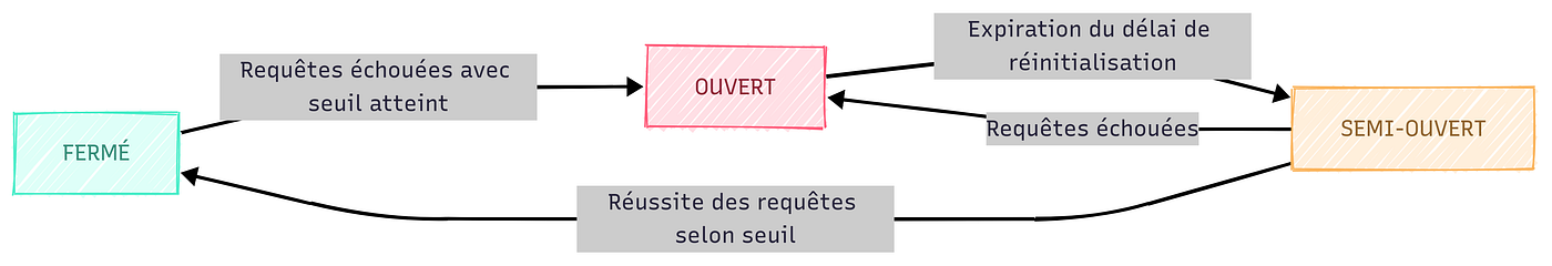 - Semi-ouvert : Après un délai de repos, le circuit breaker autorise quelques appels tests pour voir si le service est revenu. S’ils réussissent, nous refermons le circuit. Si ces essais échouent, le circuit reste ouvert.